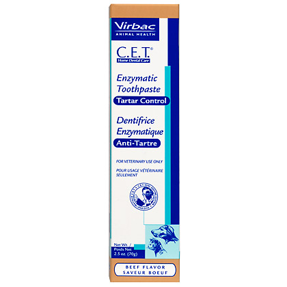 1. C.E.T. Enzymatic Toothpaste helps remove, prevent plaque build-up, and in your pet’s mouth. C.E.T. Enzymatic Toothpaste, poultry flavored or beef flavored, is formulated for use in dogs and cats as part of a three-step program of home dental care involving chews, rinsing, and brushing. The Dual-Enzyme System (glucose oxidase and lactoperoxidase) provides natural antibacterial action and neutralizes mouth odors.