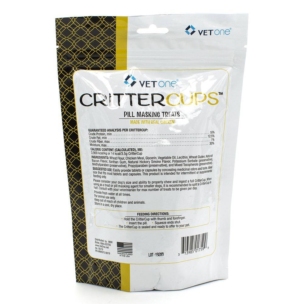 CritterCups Pill Masking Treats are soft, bacon-flavored chewable cups made with real chicken, designed to help mask the taste and odor of your dog’s medication during administration. These treats fit most tablets and capsules, making pill time easier and stress-free for both dogs and their owners.