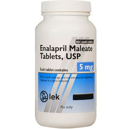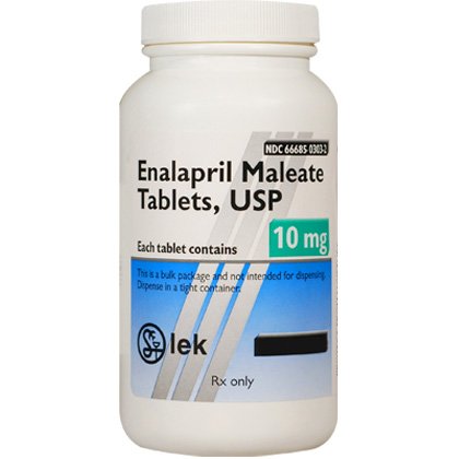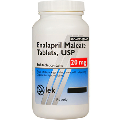 2. Enalapril works by blocking an enzyme in the body that is needed to produce a substance that causes blood vessels to tighten. As a result, the blood vessels relax. This lowers blood pressure and increases the supply of blood and oxygen to the heart. 3. Allow plenty of water for the pet to drink. It may be given with or without food. Periodic liver and kidney function testing may be required by your veterinarian. For dogs of all weights, administer 0.25 mg per lb of pet’s body weight once daily or as directed by your veterinarian. For cats of all weights, administer 0.1-0.25 mg per lb of pet’s body weight once daily or as directed by your veterinarian. 4. Do not give your pet potassium supplements unless directed to by your veterinarian. Enalapril may cause birth defects. Do not give to pregnant animals. 5. The ingredient in Enalapril Maleate Tablets 2.5 mg is Enalapril Maleate 2.5 mg. Enalapril Maleate Tablets 5 mg have Enalapril Maleate 5 mg. The ingredient in Enalapril Maleate Tablets 10 mg is Enalapril Maleate 10 mg. Enalapril Maleate Tablets 20 mg have Enalapril Maleate 20 mg. |