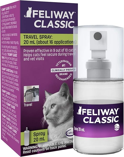 | Feliway Classic Travel Spray (20mL) is a portable version of the Feliway Classic product, specifically designed to help reduce stress and anxiety in cats during travel. The spray mimics the “facial pheromones” that cats naturally release when they rub their face on objects, creating a calming effect and helping cats feel more secure in unfamiliar or stressful environments. |