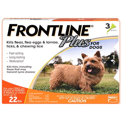 Frontline Plus provides convenient and effective flea and tick control in dogs and cats, puppies and kittens. It is effective against all stages of the brown dog tick, the American dog tick, lone star tick and deer ticks (the major carrier of Lyme disease). It also kills flea eggs and flea larvae. Frontline Plus rapidly eliminates infestations with chewing lice. Frontline Plus for Dogs and Puppies also aids in the control of sarcoptic mange infections.